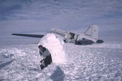 No luck: the bad weather is back. And the DC3 has to land before arriving at Blue One. It chooses Berkner Island (from where most expeditions for mini-crossings of Antarctica depart). As it's Christmas Eve, they decide to spend to evening in a makeshift igloo. |